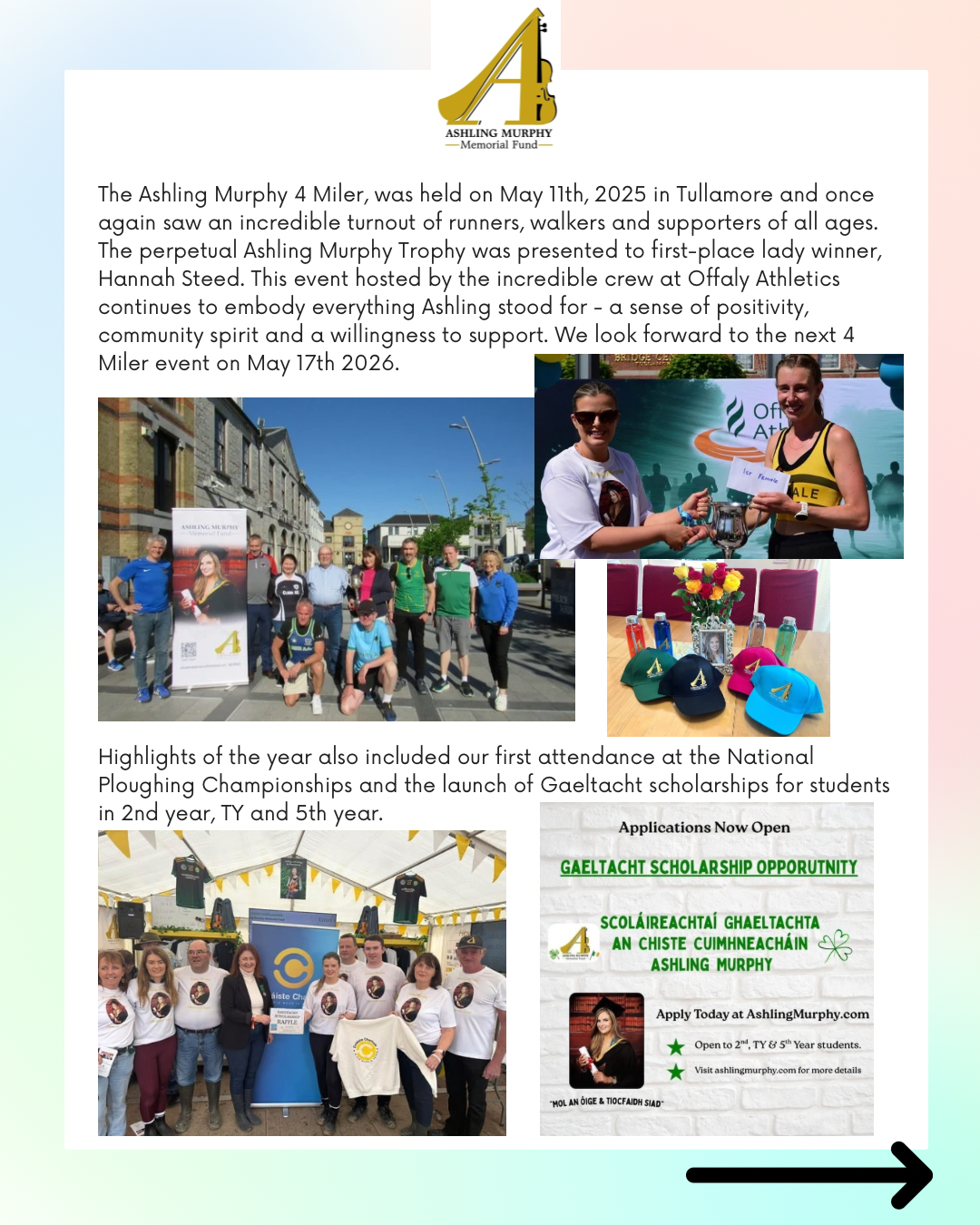 The Ashling Murphy 4 Miler, was held on May 11th, 2025 in Tullamore and once again saw an incredible turnout of runners, walkers and supporters of all ages. The perpetual Ashling Murphy Trophy was presented to first-place lady winner, Hannah Steed. This event hosted by the incredible crew at Offaly Athletics continues to embody everything Ashling stood for - a sense of positivity, community spirit and a willingness to support. We look forward to the next 4 Miler event on May 17th 2026.