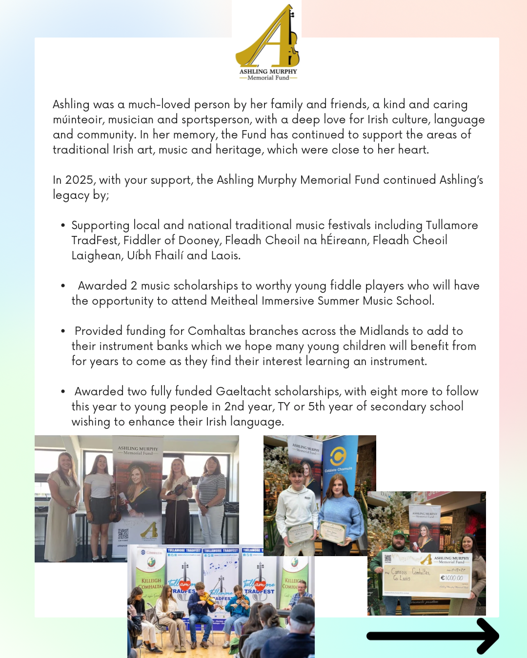 With your support, the Ashling Murphy Memorial Fund continues to nurture the Traditional Irish Arts, Culture and Heritage - ensuring Ashling’s legacy lives on in the lives of young people for generations to come. One of Ashling's favourite and most used seanfhocal says it all: "Mol an Óige agus Tiocfaidh Siad"