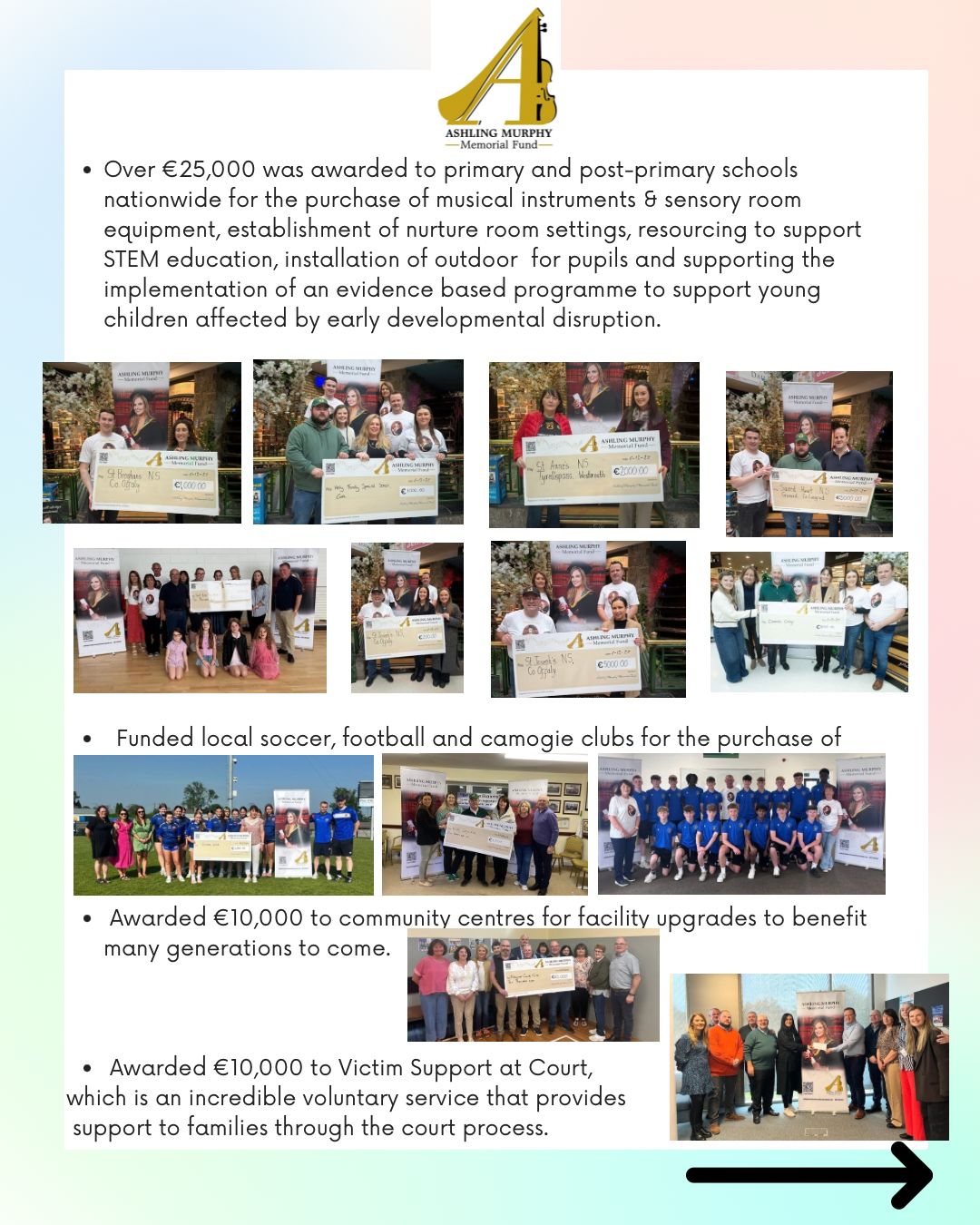 - Awarded €10,000 to Victim Support at Court, which is an incredible voluntary service that provides support to families during the court process.